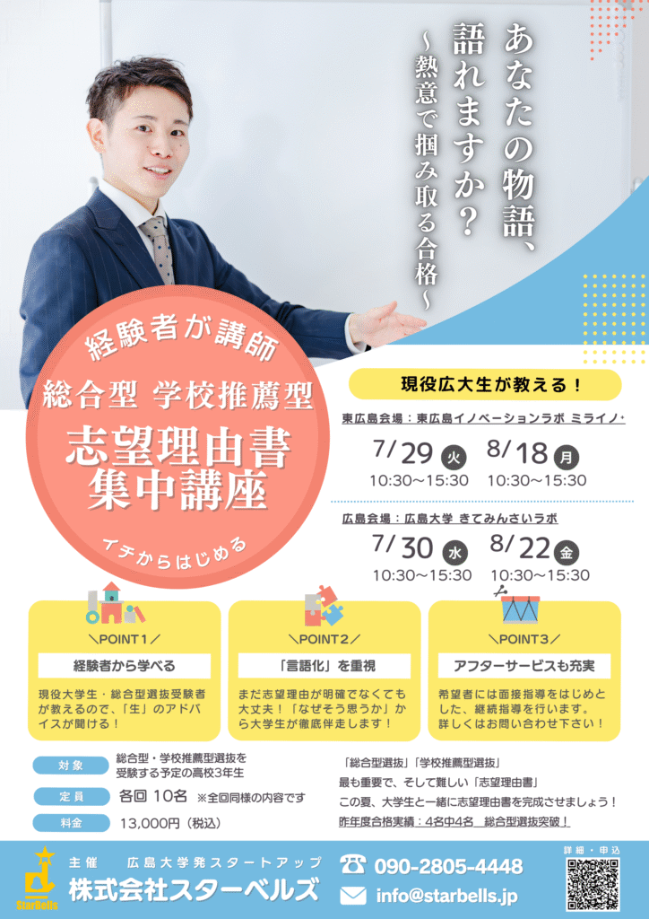 ?【志望理由書集中講座 開催!】?総合型・学校推薦型選抜を目指す高校3年生のための1日集中ワークショップ。現役広大生&合格者が「あなたの物語」を言語化し、熱意ある志望理由書を一緒に完成させます! ? こんな方におすすめ なかなか“志望理由”...